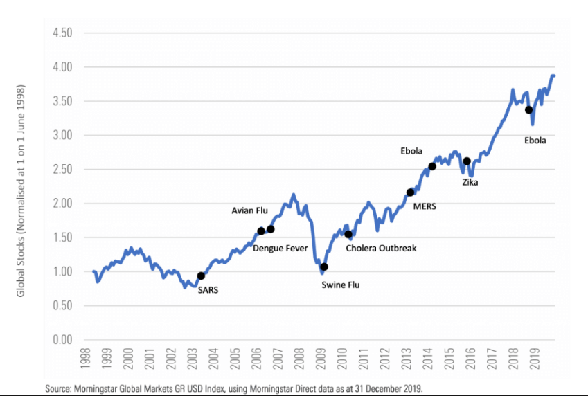Over time though, we’ve seen that markets are resilient against global epidemics. Even if the immediate impacts cause a temporary fall, the long-term trend is positive: