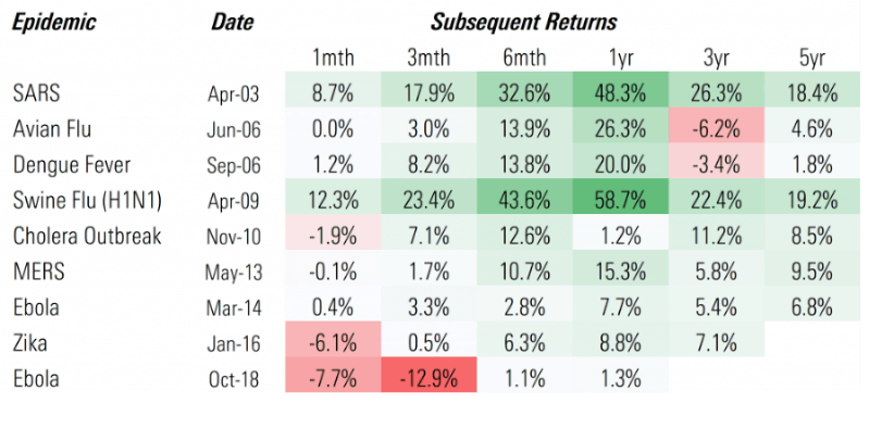 The chart below also shows how markets can rebound following some of the major epidemics in recent history: